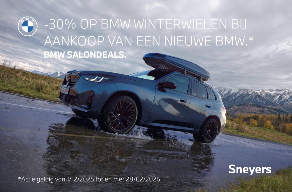 -30% op BMW Winterwielen.* Regen, gladde wegen of sneeuw? Met BMW Winterwielen blijft u elke kilometer in controle. Bij aankoop van een nieuwe BMW geniet u van 30% op een complete BMW Winterwielenset. Zo trotseert u de winter moeiteloos én stijlvol. *Actie geldig van 1/12/2025 tot en met 28/02/2026BMW, Sneyers